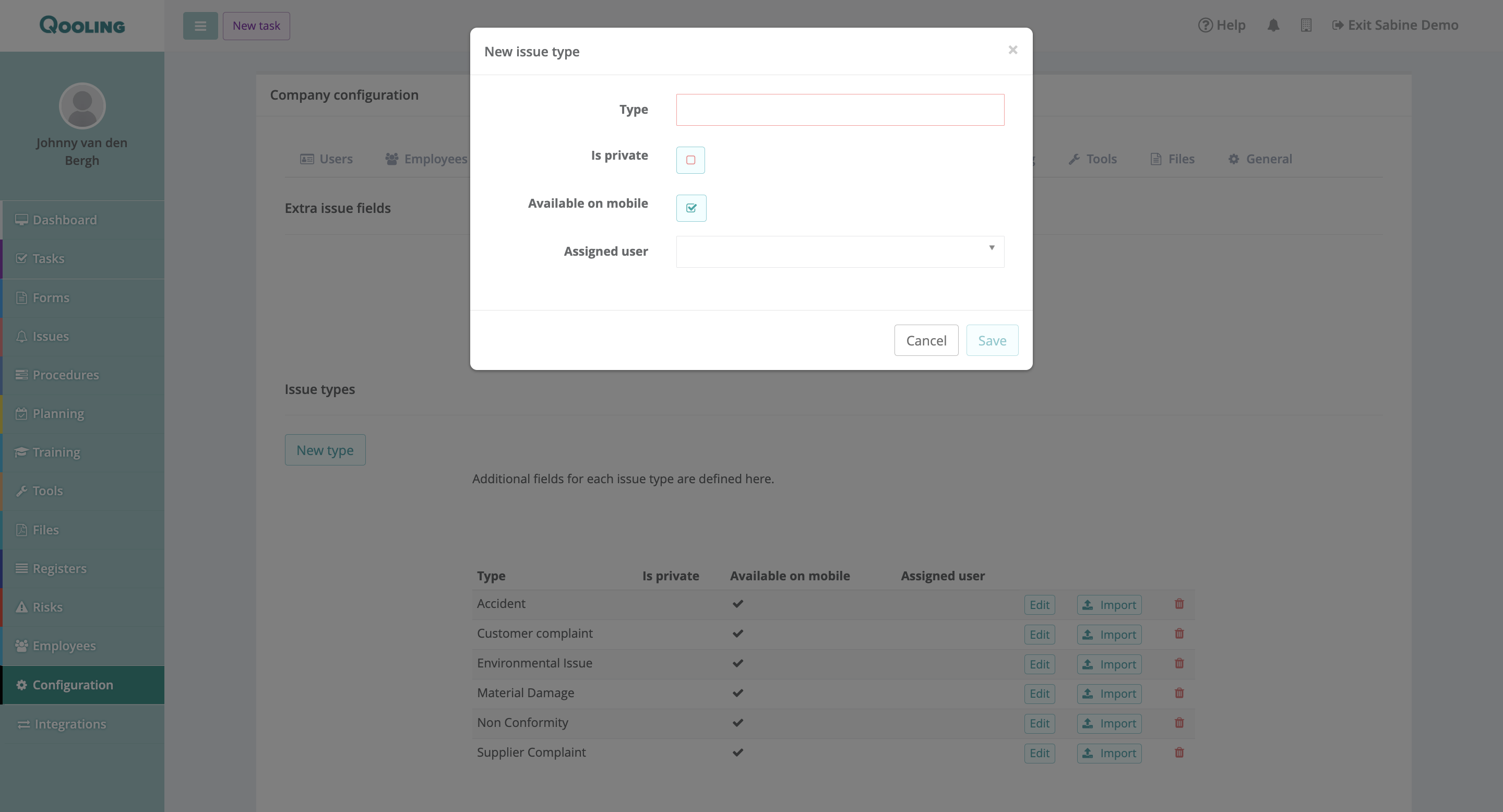 Fill in the type name, select if the content is private and assign the user who is responsibly for the issue type.