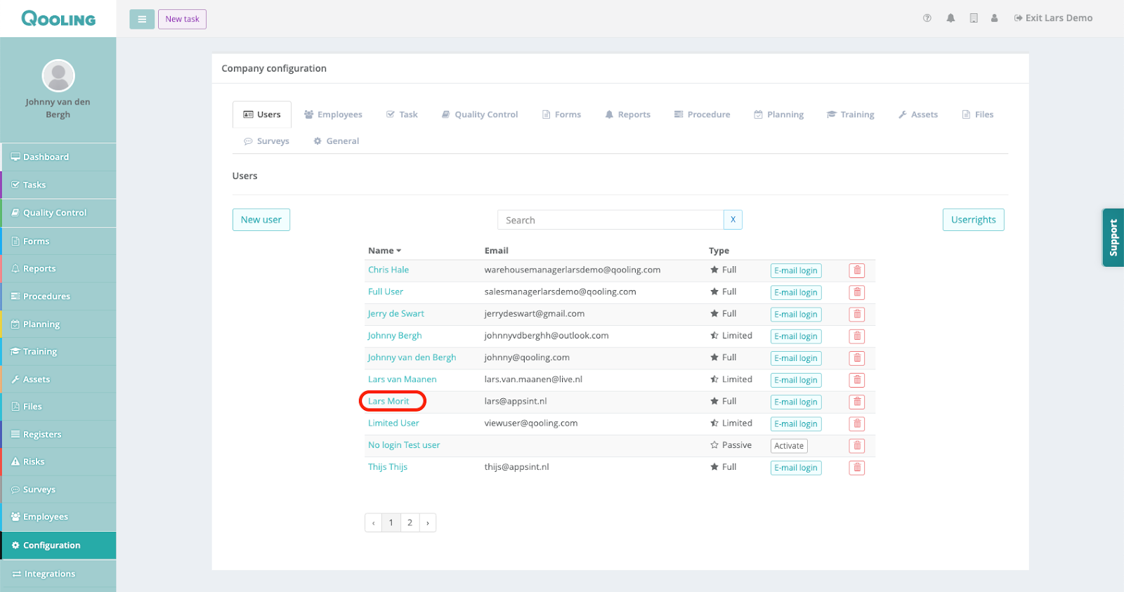 You can find the 'Configuration' button in the menu on the left side of your screen. After that, click on the name of the employee that you want to assign a new e-mail address.