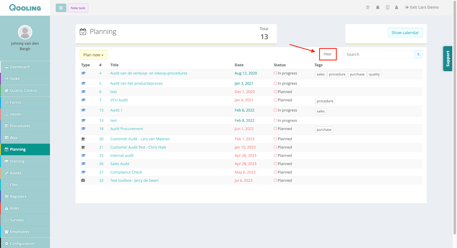 Stap 4: Go back to the ‘Planning’ module. Click on the filter symbol.