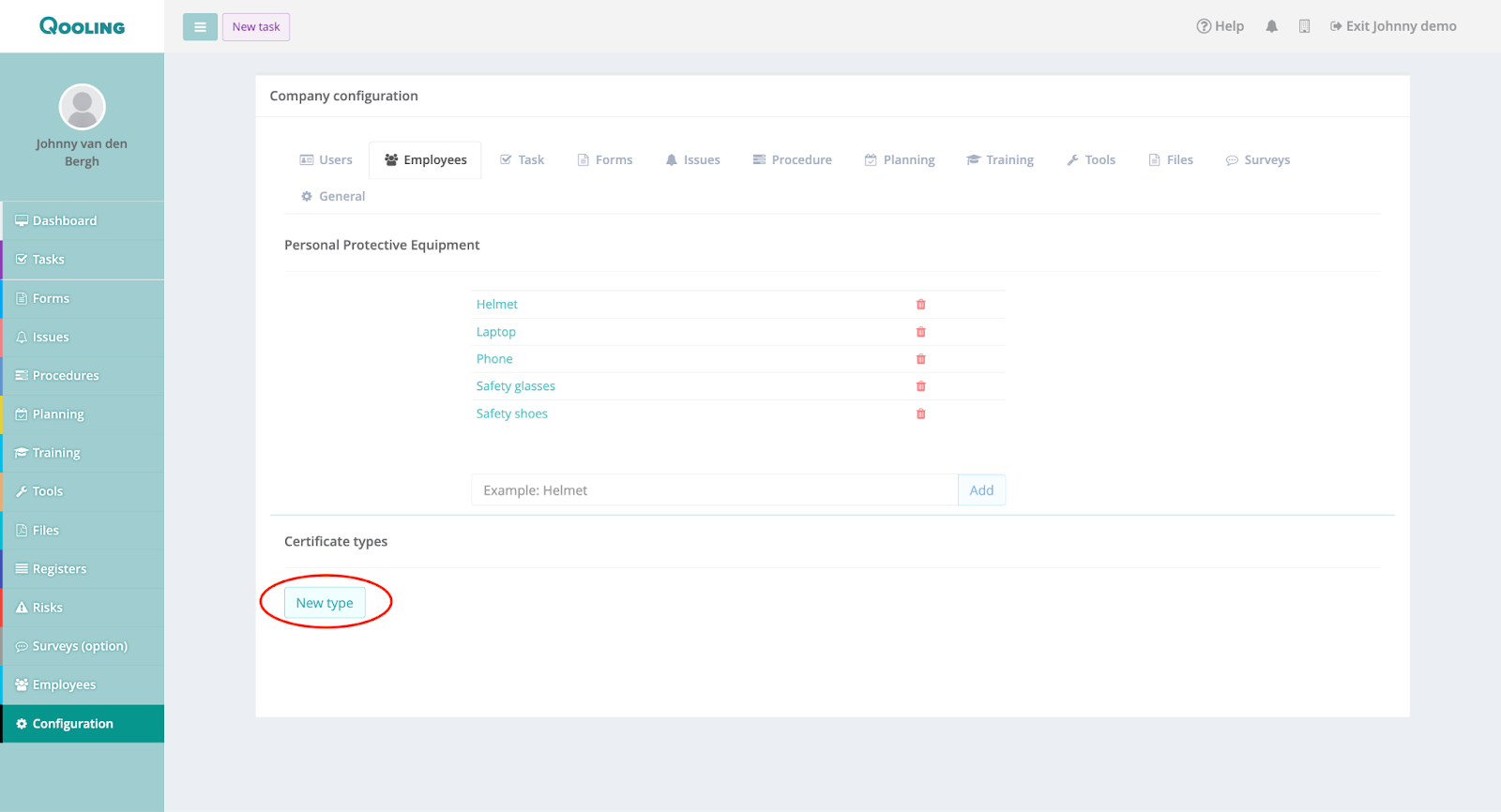 Step 3: Click on the 'New type' button, at the Certificate types section.