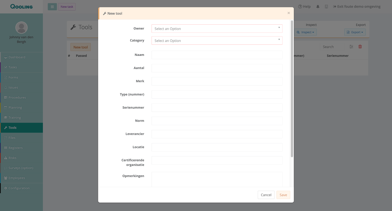 Fill in all the information regarding the tool, including the owner and the category (which are required fields), and all the additional information about this tool. Once you are done, click on the ‘Save’ button.