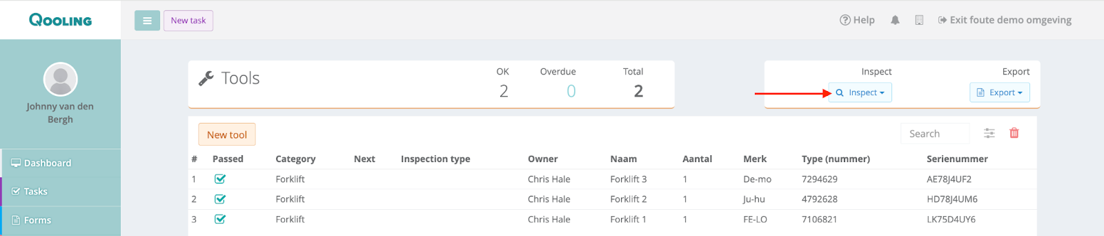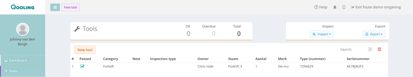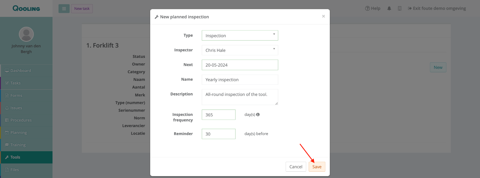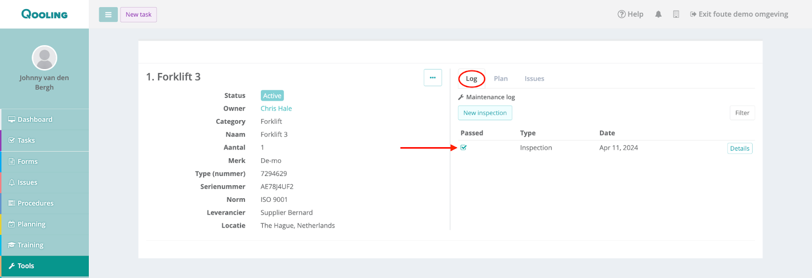 If you click on one of the tools now, you can see the inspection in the ‘Maintenance’ tab.