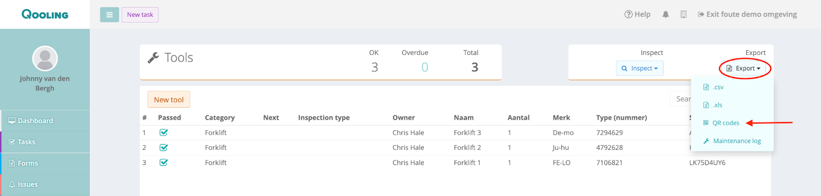 To create unique QR-codes of your tools, click on the ‘Export’ button at the top right corner, and select ‘QR-codes’.