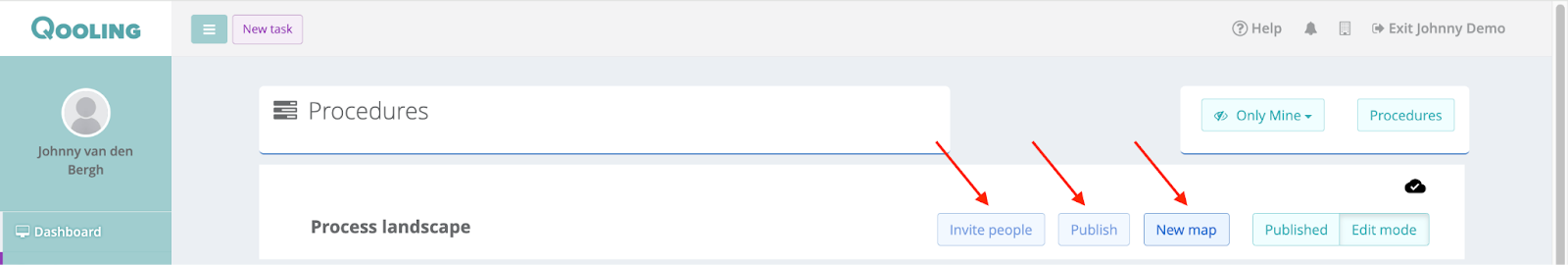 Invite people: clicking this button, it will generate a link that you can send out to users of Qooling. This way, the users can see the draft of the process landscape.