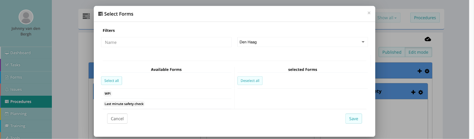 It is possible to only be able to choose from [procedures/documents/forms] that are assigned to a particular group. For example, if I wanted to add a new form to one of the maps, and at the ‘group’, I selected ‘The Hague’, I can only see the forms that are assigned to this group.