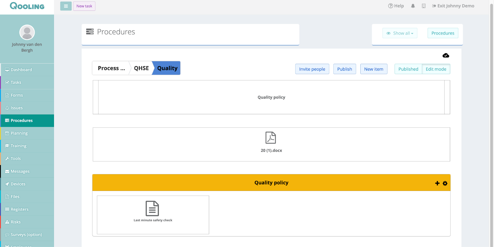 At the ‘Quality policy’ map, there is a possibility to add new processes, documents, or forms. Also, it's possible to add another map, in this map. For this example, we will add another form in this ‘Quality policy’ map.