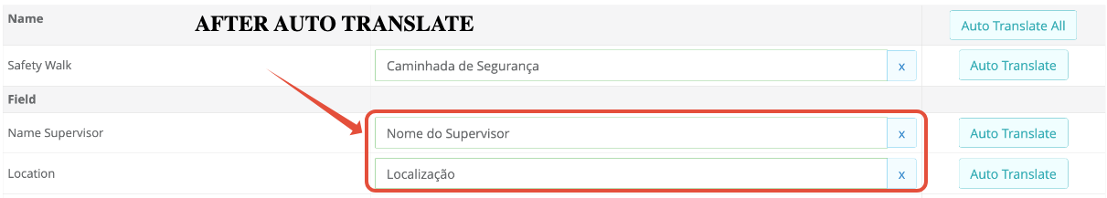 - To translate automatically click on the button "Auto Translate". You can either auto translate a field or translate all at once.